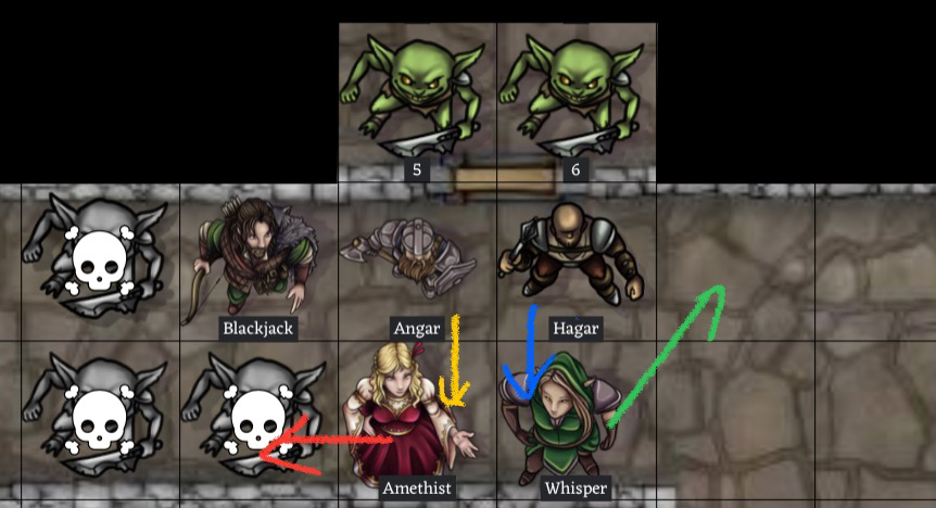 If we rearrange our characters positions, we could surround the goblins as they come out the door allowing us more melee attacks.