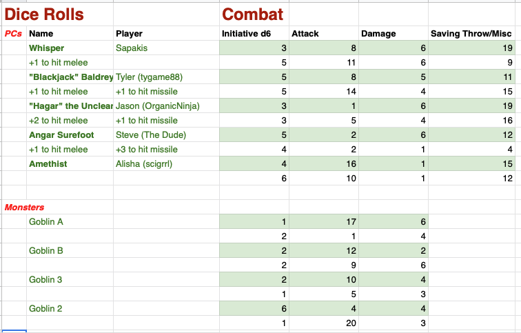 FYI, in case you want to see how I'm tracking dice rolls, green highlighted is 1st round