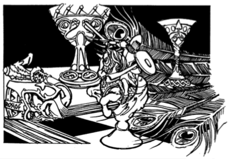 Further searching of the room reveals nothing new. Heading out into the corridor, searching for secret doors turns up nothing as well. You head further down the corridor to the west, until you reach a door in the south wall. Wirlt listens at the door, and hears nothing. You open the door and enter. This room has a door in the north wall (the one you entered through), and another door on the south end of the west wall. Directly across from the northern door is a huge wooden table still in good condition. Behind it is a huge ornately carved wooden chair. On the table is a candle sconce, a feathered quill, a blank scroll, and a string of colored wooden beads. Next Step: Describe how you will proceed and then roll .turn dice.