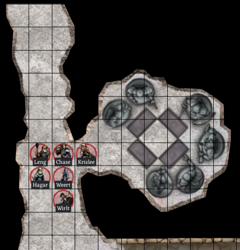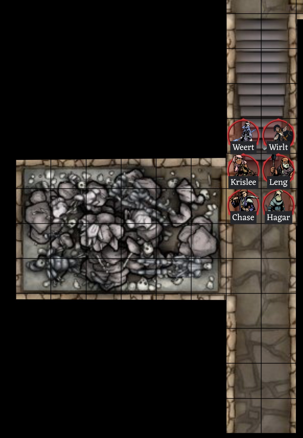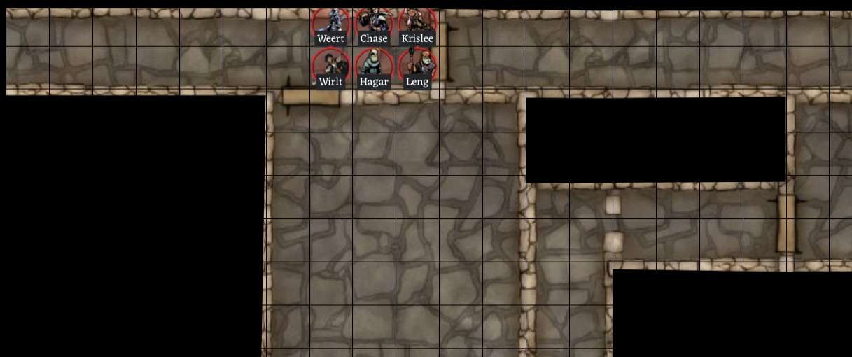 “I’m gonna look around a bit, but it doesn’t look like much is here. Then let’s go South.” Chase searches for hidden doors and anything else of note. Then waits by the south door. (edited)