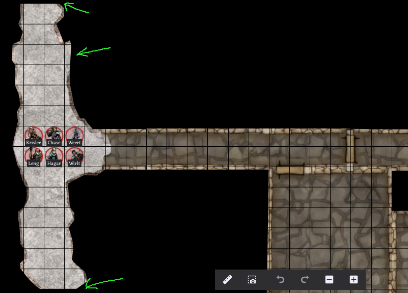 You proceed east through the cavern corridor, and quickly encounter another narrow passageway that heads south around a corner. The larger passageway turns to the north, where at the edge of the light, you can see it narrows considerably. Before that narrow passage to the north though, you can see that another passageway branches off to the east again, around a corner. (Note green arrows added to the map to show cavern passageways that have not been explored) Next Step: Describe how you will proceed and then roll .turn dice.