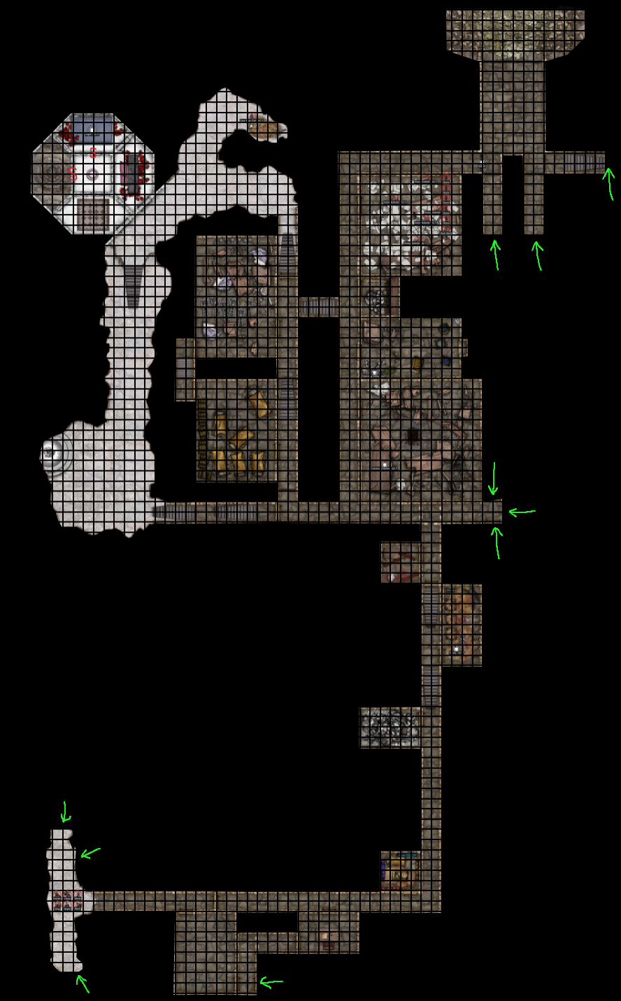 Heading back west down the corridor, the worked walls and floor end about 40 feet beyond the door in the south wall, and you enter natural caverns once again. There is a roughly north/south natural passage here, with what appears to be another branch to the northeast about 15 feet down the north corridor (green arrows on map show where passages continue past your what you can see with your light). Next Step: Describe how you will proceed and then roll .turn dice