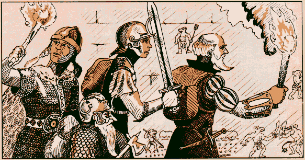 The tunnel twisted along for a while (Pippin's Detect Trap spell is now expired), coming to a dead end. After spending some time searching for secret doors, Ballador Darkhammer finally succeeded in finding one at the end of the hallway. Opening it, the party moved into the room: