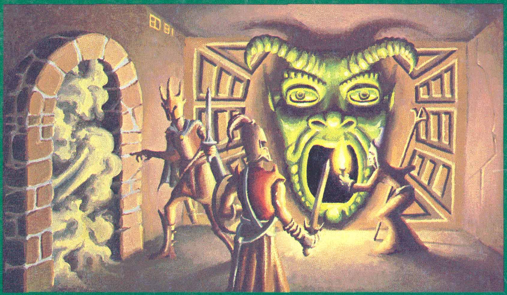 The other fork of the path leads right up to an evil-appearing devil face set in mosaic at the corridor's end. The face has a huge "O" of a mouth; it is dead black.
