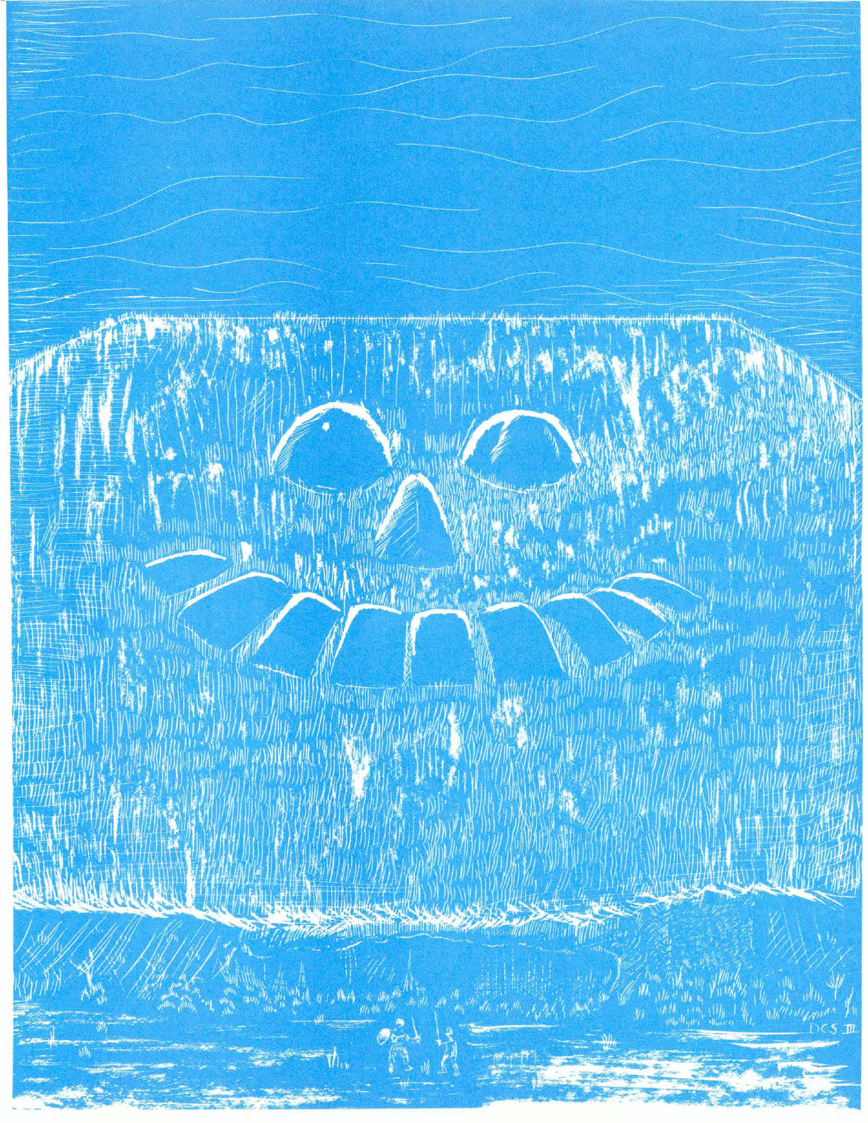 The party has arrived at the site of the demi-lich's last haunt. Before them is a low, flat topped hill, about 200 yards wide and 300 yards long. Only ugly weeds, thorns, and briars grow upon the steep sides and bald top of the 60' high mound. There are black rocks upon the top of the hill, and if these are viewed from a height of about 200' or so above the mound, it will be seen that the whole is shaped like a human skull, with the piles of rock appearing as eye holes, nose hole, and the jagged teeth of a grinning death's head.I paused here to show the illustration from the module, and commented that I think it's one of the worst drawings I've seen in the old TSR modules.