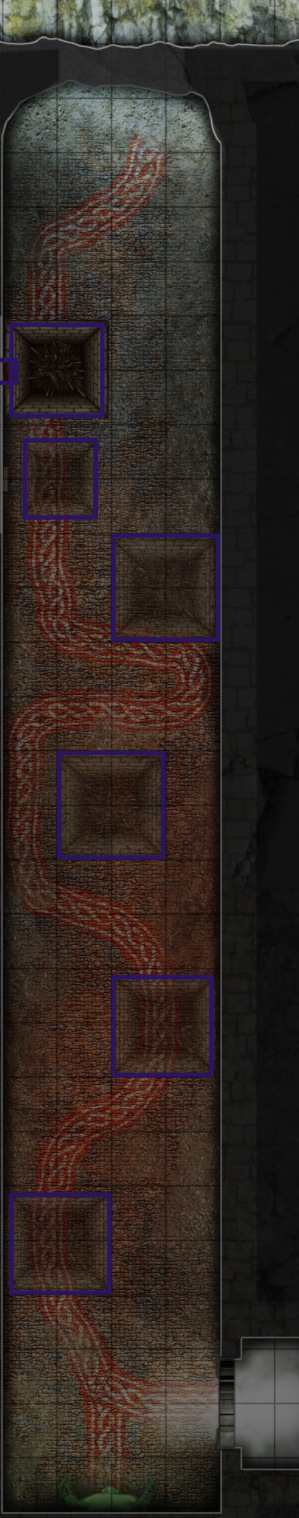 This area is where the torture chamber is painted, and the wall hiding this passage shows a painting of the iron door which evidently confines some sort of a horrid creature (its taloned and scaled hands grasp the bars of its small window which can be loosed to torment prisoners.The door can be seen in drawing #3 above.