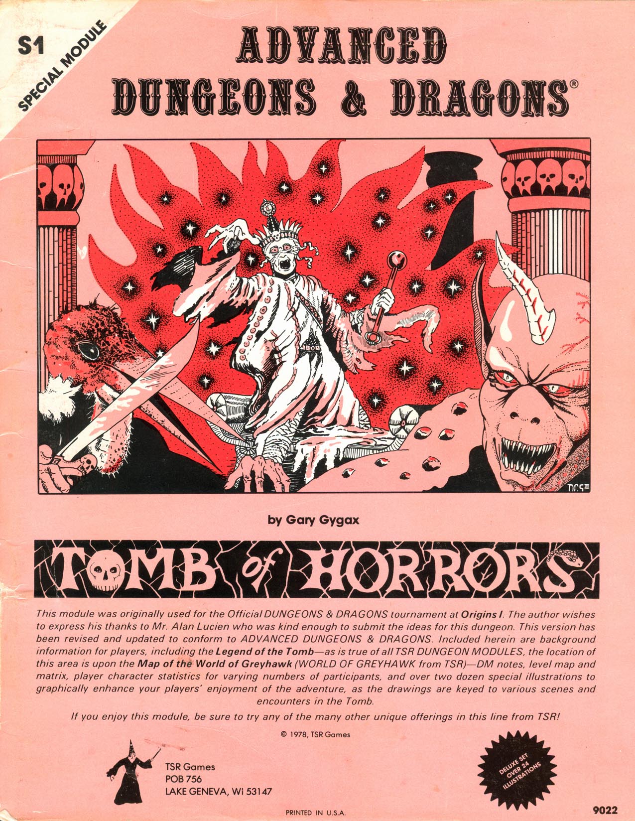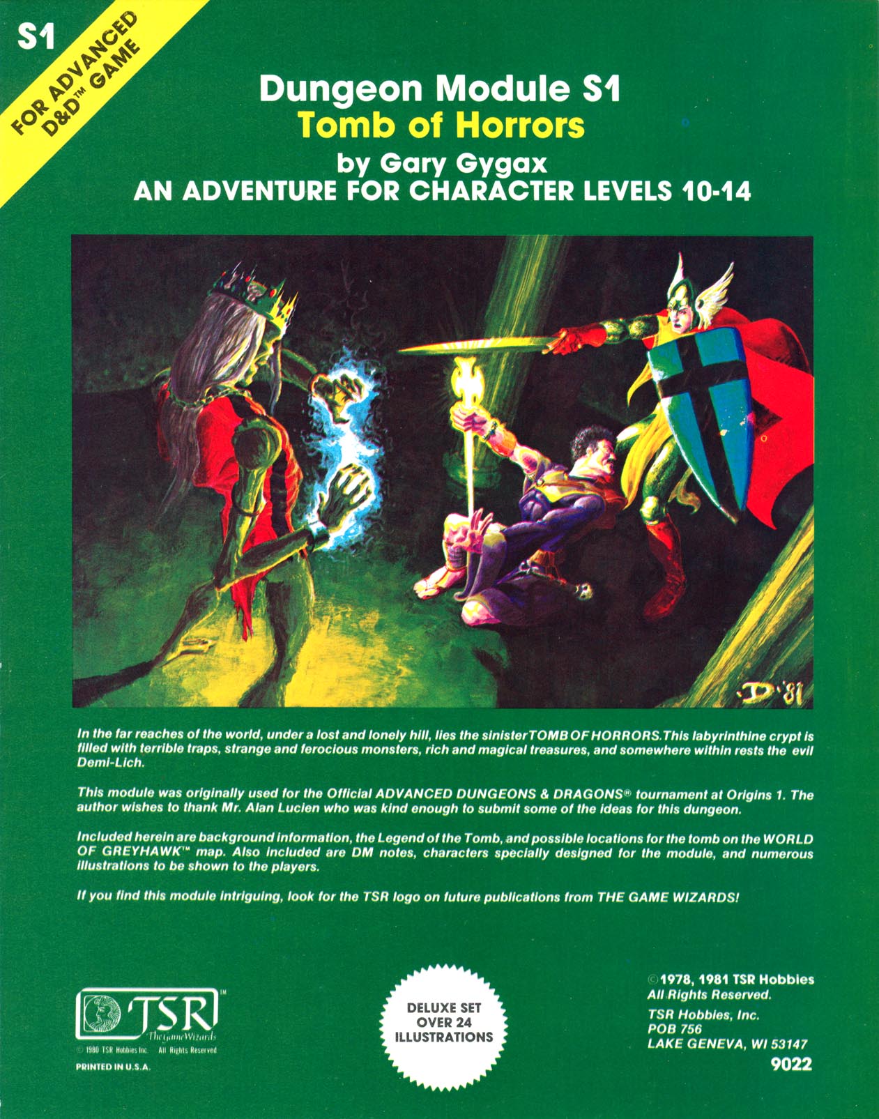 Somewhere under a lost and lonely hill of grim and foreboding aspect lies a labyrinthine crypt. If is filled with terrible traps and not a few strange and ferocious monsters to slay the unwary. It is filled with rich treasures both precious and magical, but in addition to the aforementioned guardians, there is said to be a demi-lich who still wards his final haunt. (Be warned that tales told have it that this being possesses powers which make him nearly undefeatable!) Accounts relate that it is quite unlikely that any adventurers will ever find the chamber where the demi-lich Acererak lingers, for the passages and rooms of the Tomb are fraught with terrible traps, poison gases, and magical protections. Furthermore, the demi-lich has so well hidden his lair, that even those who avoid the pitfalls will not b e likely to locate their true goal. So only large and well-prepared parties of the bravest and strongest should even consider the attempt, and if they do locate the Tomb, they must be prepared to fail. Any expedition must be composed of characters of high level and varied class. They must have magical protections and weapons, and equip themselves with every sort of device possible to insure their survival.I mentioned that there is an option in the module to provide possible locations for the tomb and for the party to search to find it, but we're skipping that part to get to the action. So we assume the party found the tomb location.