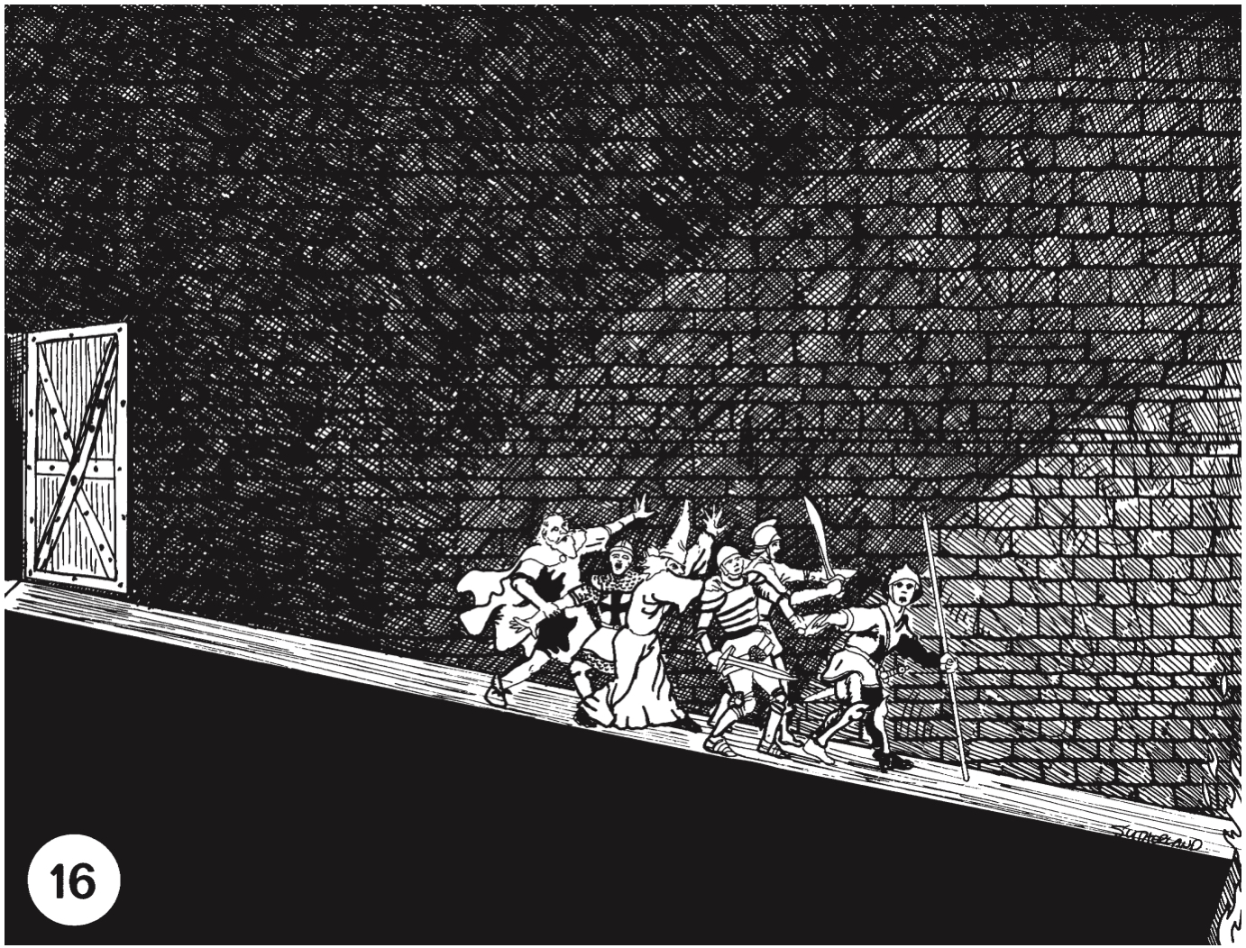 The party moved cautiously forward, tapping the floor again, until at a point some 40 feet from the door, a click was heard and the floor started tilting downward to the north. I waited a prescribed time for anyone to tell me how they would react, but no one did. So I showed this picture: