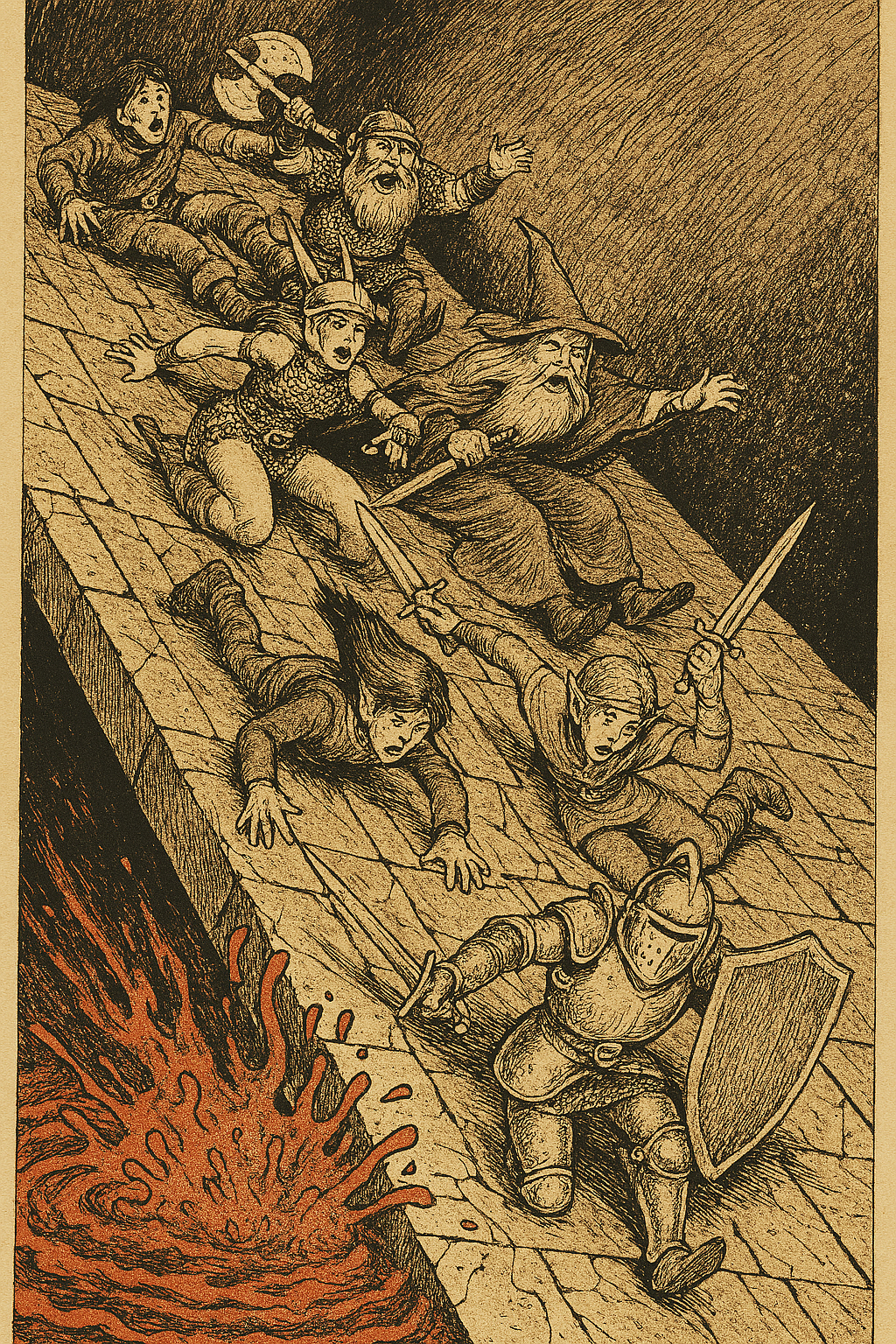 The tilting had hit the point of no return, and the party slid downward on the increasingly tilting floor until they were all dropped into a pit of flames and molten lava.