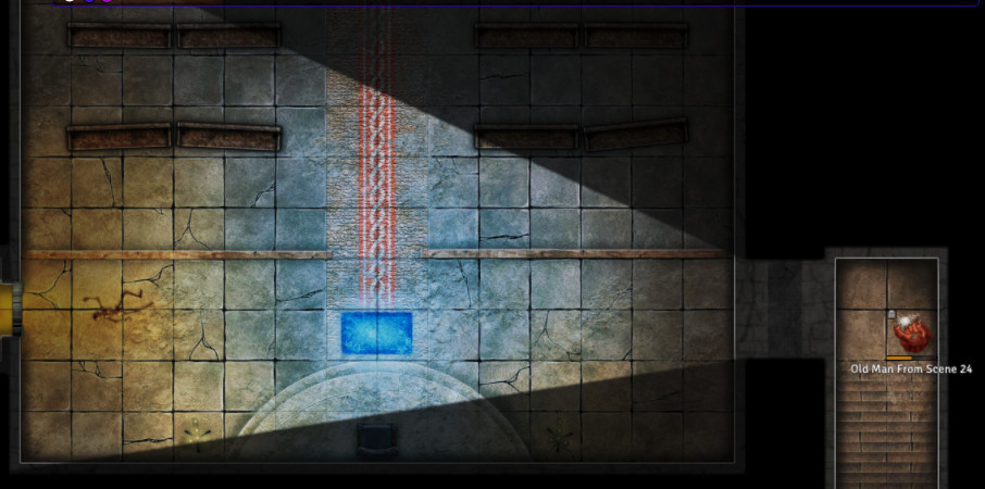 The corridor beyond turned south with stairs heading down. Walking carefully, and tapping in front of themselves with a 9 foot pole, the party moved down the stairs, turned the corner, and stopped at a door.
